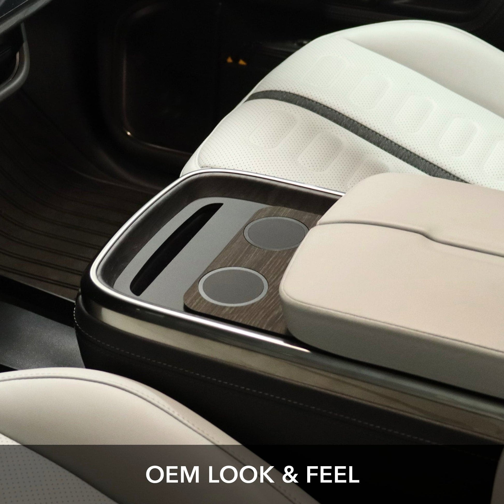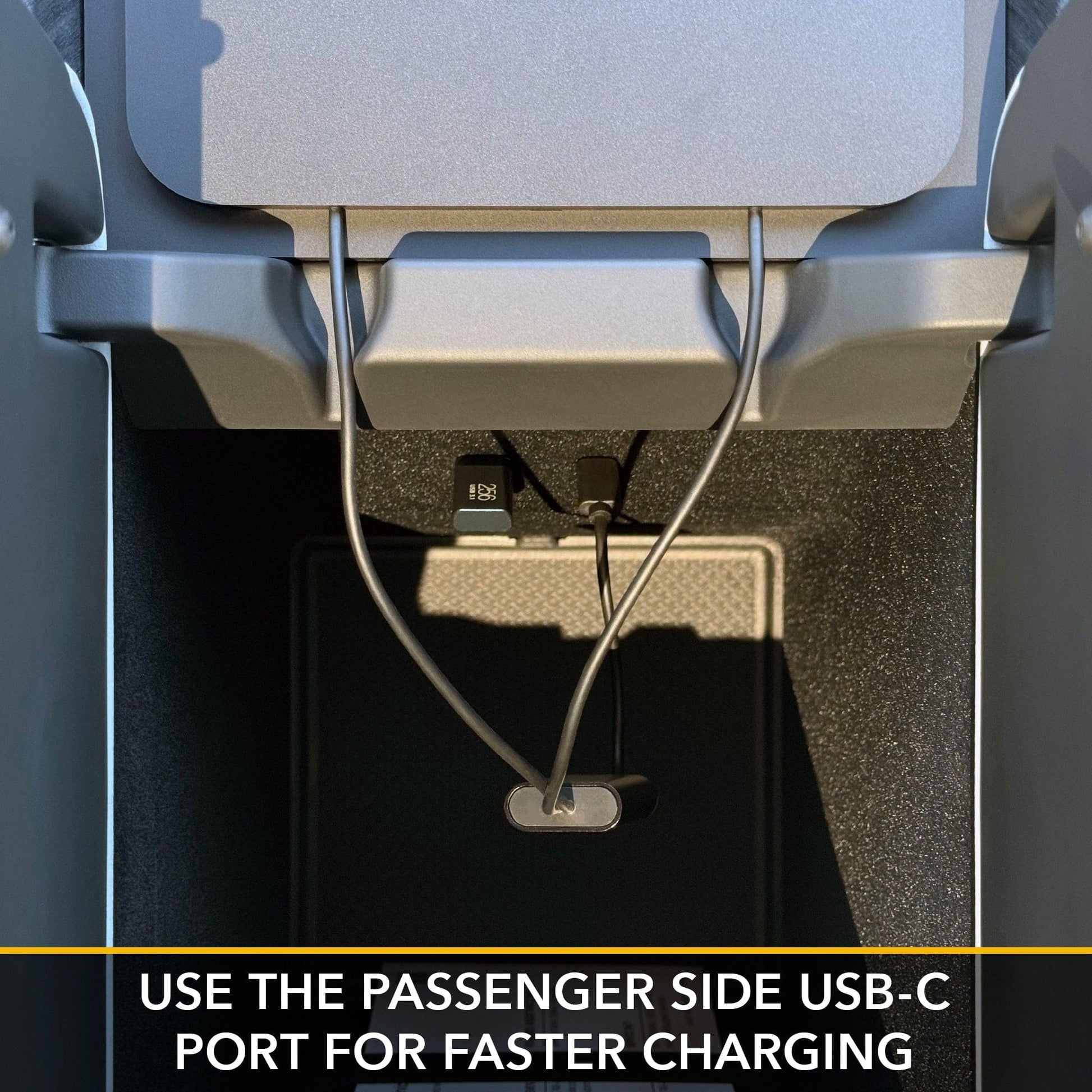 A must have for any iPhone user with a Rivian, this charger features 2 x 7.5W MagSafe pucks that join into a single cable, so only one USB-C port is occupied. All of this built into a heavy premium body made to fit precisely into the armrest area.