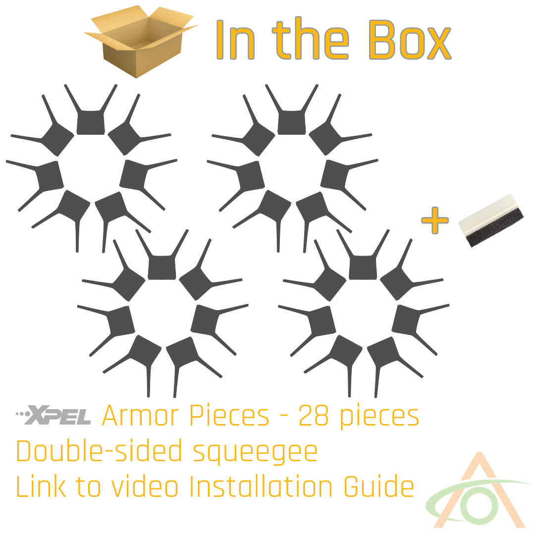 This kit comprises 28 pieces (7 pieces per all-terrain wheel), together with a double-side squeegee. Installation is easy, all you need to do is ensure your wheels are clean of any dirt, brake dust or wax (i.e. tire shine), and take your time to install each piece. Please watch the video linked below before starting your installation.